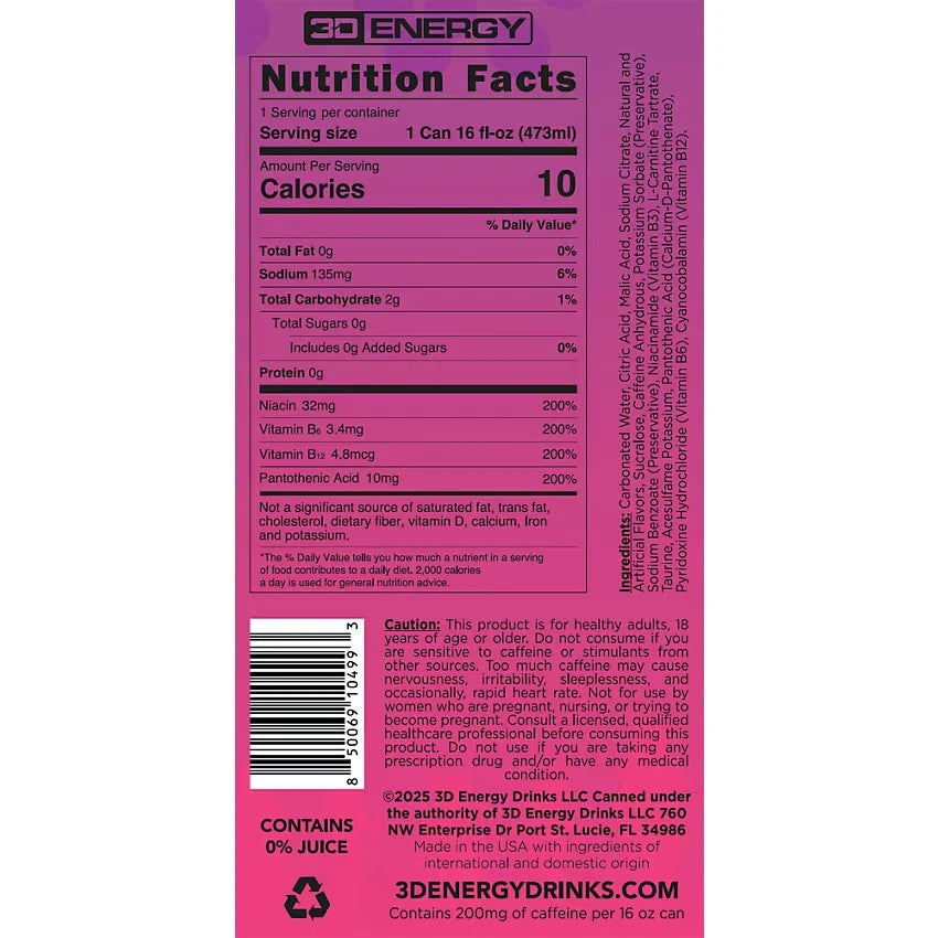 - FUNCTIONAL ENERGY BEVERAGE: 3D Energy Drink is packed with 200 mg of caffeine to get you going, but with zero sugar to avoid the crash. 3D flavors are smooth, lightly carbonated, bursting with bold flavors to take you further every day. Ingredients like Taurine and L-Carnitine provide a stable boost of energy making this a preworkout favorite among athletes and gym-goers alike.