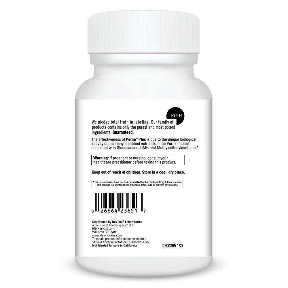 A dietary supplement to support proper joint and connective tissue functions.* The effectiveness of Perna® Plus is due to the unique biological activity of the many identified nutrients in the Perna mussel combined with Glucosamine, Methylsulfonylmethane (MSM), Dimethylglycine (DMG), and Manganese. Research indicates that joint dysfunction may be related to immune response, so the inclusion of our patented DMG is a natural fit for Perna® Plus. DMG is a versatile health-building factor that can support a balanced immune system. FoodScience Corporation, the parent company of DaVinci® has been awarded 3 U.S. Patents on DMG in the area of immune response.