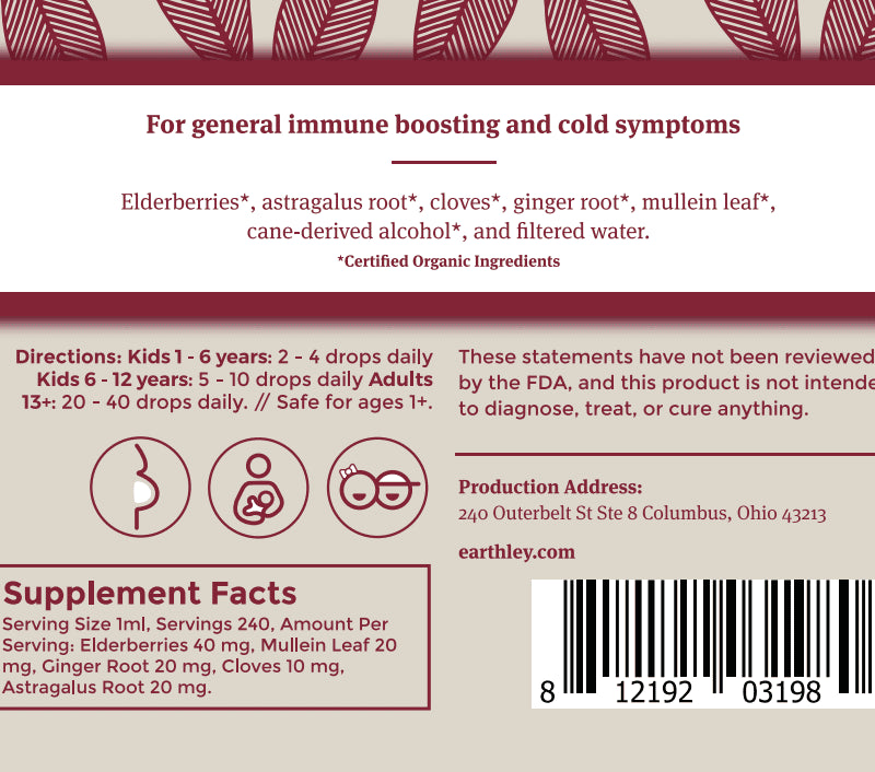 Elderberry Elixir is a liquid botanical remedy that combines elderberries with lung- and immune-supporting herbs. It’s shelf-stable, super-concentrated, and easy to use! Elderberry has a long history of use for both daily immune support and as a respiratory remedy. Our formula is more powerful than elderberry alone because of its complementary herbs! It is made with certified organic ingredients and is available in Original (made with alcohol) and Kids (alcohol-free).