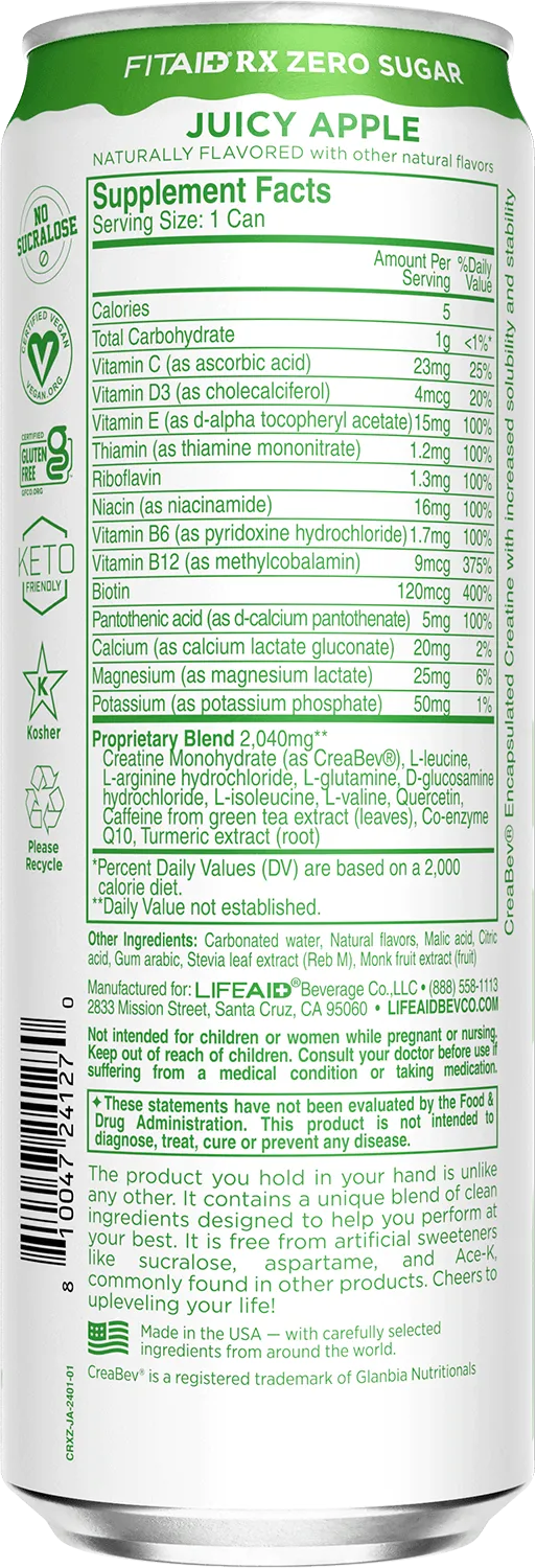 FITAID RX Zero Sugar Juicy Apple delivers a crisp and refreshing apple flavor with a hint of natural sweetness, reminiscent of biting into a freshly picked apple on a sunny day. The absence of sugar allows the pure essence of ripe apples to shine through, providing a guilt-free and invigorating taste experience. With each sip, enjoy the crispness and juiciness of apples in a convenient and revitalizing post-workout blend.