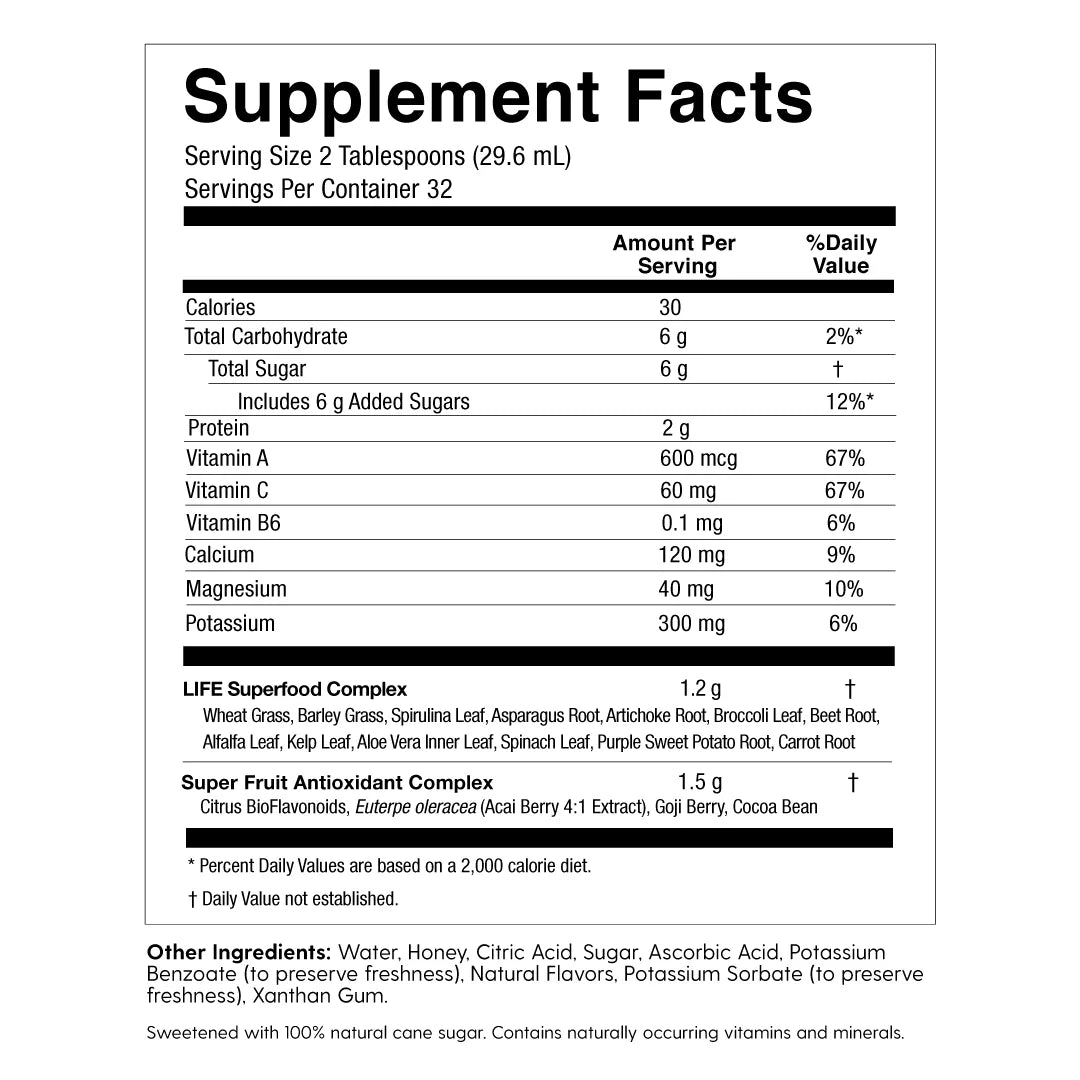 Suggested Use: Shake well before using. Take 2 tablespoons (1fl. oz.) daily as a dietary supplement. May be mixed in water, juice or any other beverage. Children under 2 years of age cannot digest honey and should not take LIFE. Refrigerate after opening.