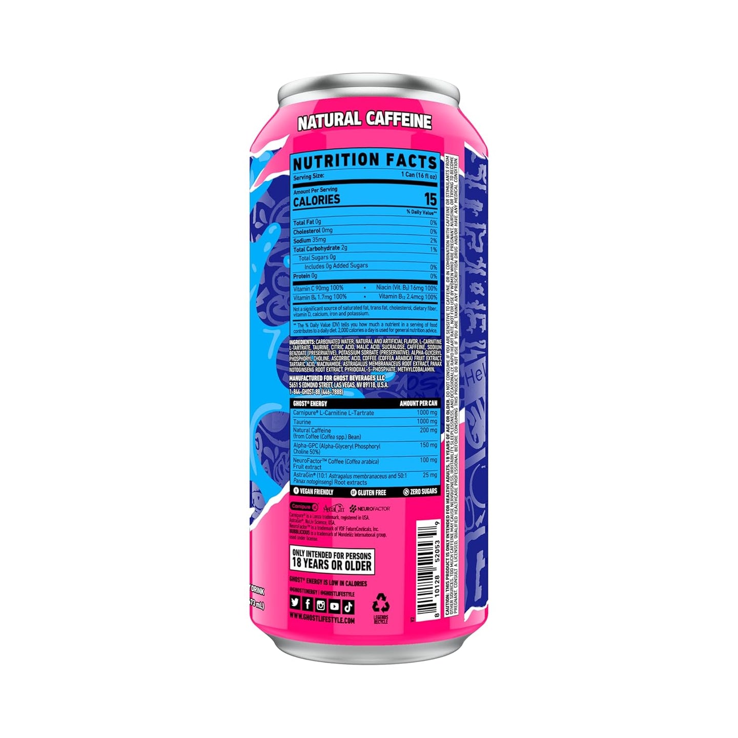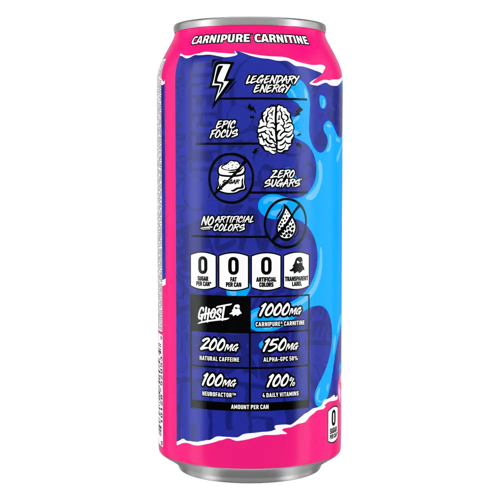 - Legendary Energy: Each can of GHOST Energy contains 200mg of natural caffeine derived from coffee beans, delivering a smooth and sustained energy boost with minimal jitters and no crash. This makes it an excellent choice for athletes, students, or anyone needing to maintain focus and energy throughout the day.