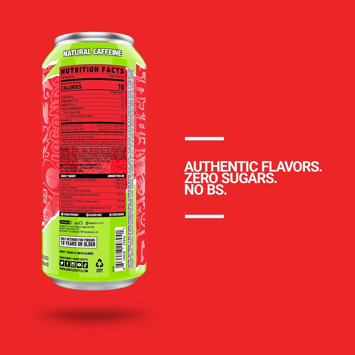 - Legendary Energy: Each can of GHOST Energy contains 200mg of natural caffeine derived from coffee beans, delivering a smooth and sustained energy boost with minimal jitters and no crash. This makes it an excellent choice for athletes, students, or anyone needing to maintain focus and energy throughout the day.