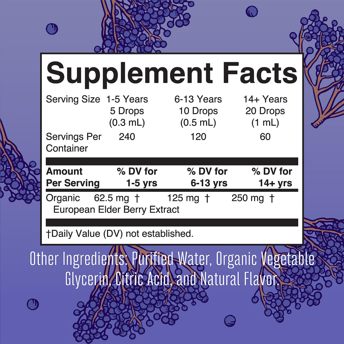 Vegan Formula: Per Serving (20 Drops): 250 mg Organic European Elder Berry Extract. Add to water | beverage of choice | or take directly. Follow dosage chart: 6 months - 5 years: Up to 5 drops (62.5 mg) | 6 - 13 years: Up to 10 drops (125mg) | 14 years and up: Up to 20 drops (250 mg). Each bottle comes with 30 servings. Free of All Common Allergens: USDA Organic | Non-GMO | Vegan | Made in a GMP (Good Manufacturing Practice) Facility. Dairy Free | Nut Free | Gluten & Wheat Free | Soy Free | Corn Free | Nightshade Free | Sugar Free | Kid Friendly. Formulated for the whole family! Shake well before each use.