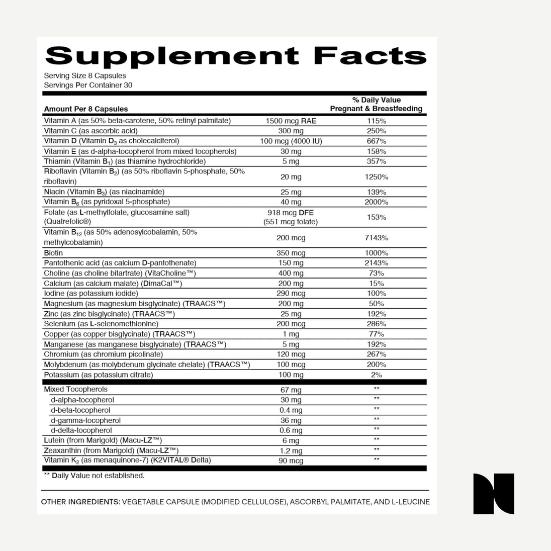 A Prenatal Multi to help mamas thrive, not just survive, is needed. Formulated by regularly testing the nutrient levels of mamas before, during, and after pregnancy to determine what’s truly needed: 24 optimally-dosed, expertly-vetted forms of vitamins, minerals, and antioxidants for mama’s and baby’s nourishment. Delivered in a convenient, nausea-free, easy-to-take capsule. Take before, during, and after pregnancy — and even beyond. 30-day supply.