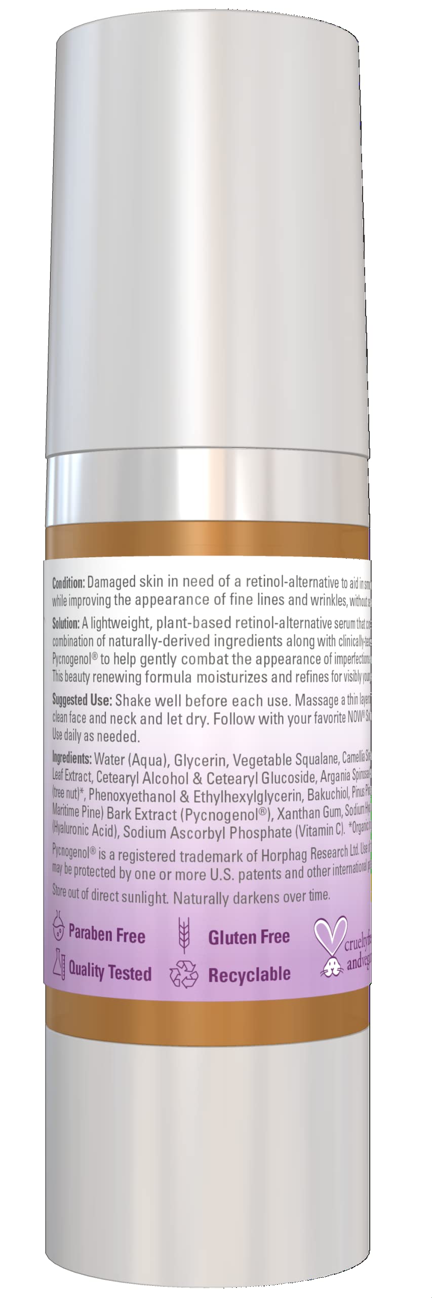 Solution: A lightweight, plant-based retinol-alternative serum that contains a combination of naturally-derived ingredients along with clinically-tested bakuchiol and Pycnogenol® to help gently combat the appearance of imperfections and wrinkles. This beauty renewing formula moisturizes and refines for visibly younger-looking skin.