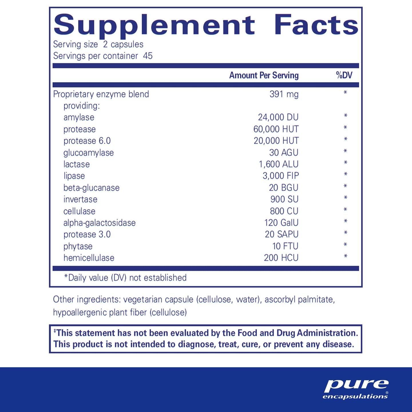 Pure Encapsulations Digestive Enzymes Ultra is a unique blend of vegetarian digestive enzymes designed to support enhanced nutrient absorption, plus digestion of protein, carbohydrates, fats, fiber, and dairy.