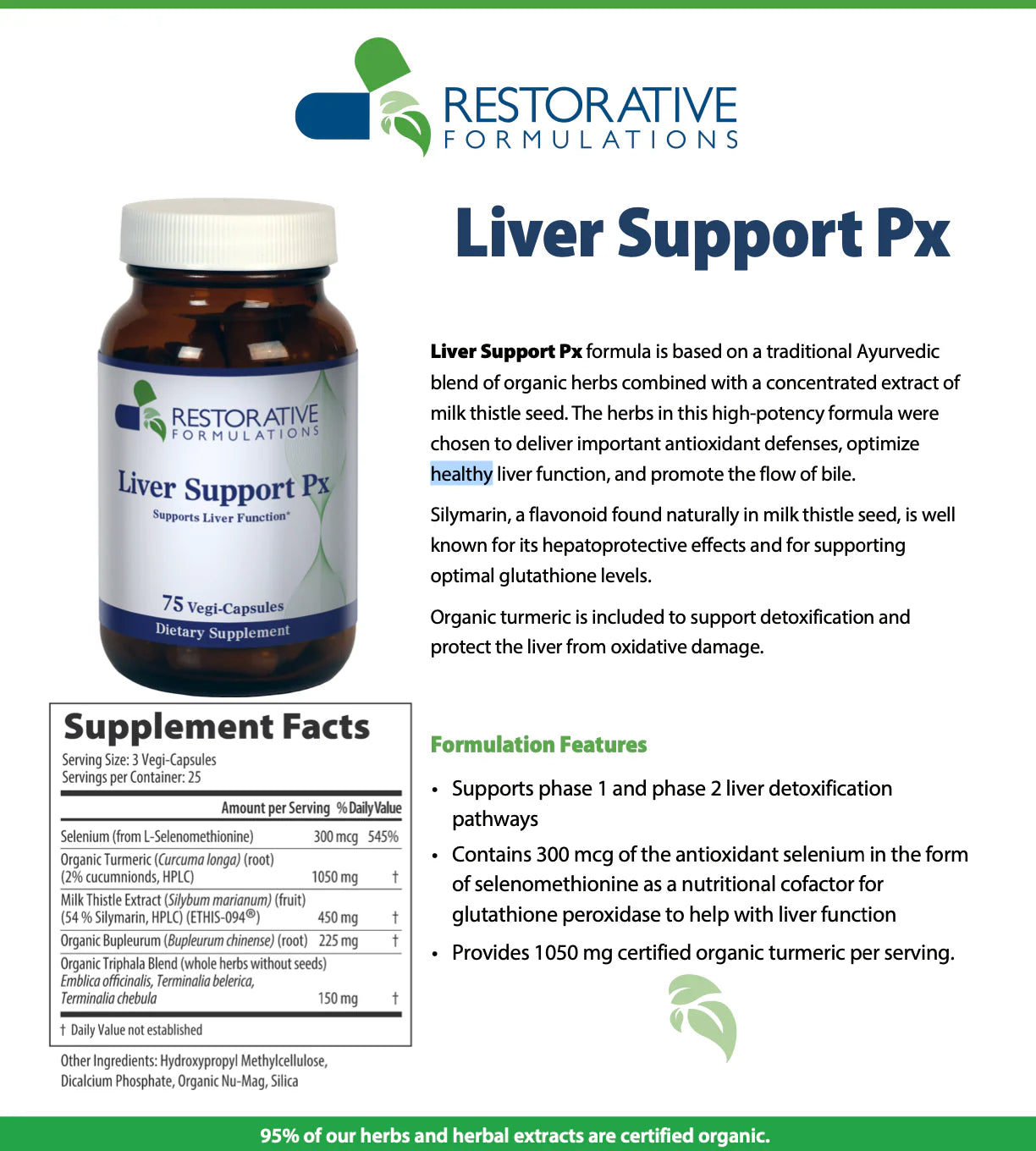 Liver Support Px formula is based on potent herbs from Ayurveda and Chinese medicine which have been traditionally used to support the liver, combined with a concentrated extract of Milk Thistle seed. The combination of herbs in this high-potency formula were chosen to deliver important antioxidant defenses, optimize healthy liver function, and promote the flow of bile.