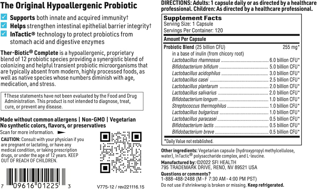 Ther-Biotic® Complete is a robust, broad-spectrum, hypoallergenic blend of 12 probiotic species in a base of inulin. Designed to supply a complete spectrum of synergistic and complementary species, each capsule provides 25 billion CFU protected by our proprietary InTactic® technology for maximum viability throughout the intestinal tract.
