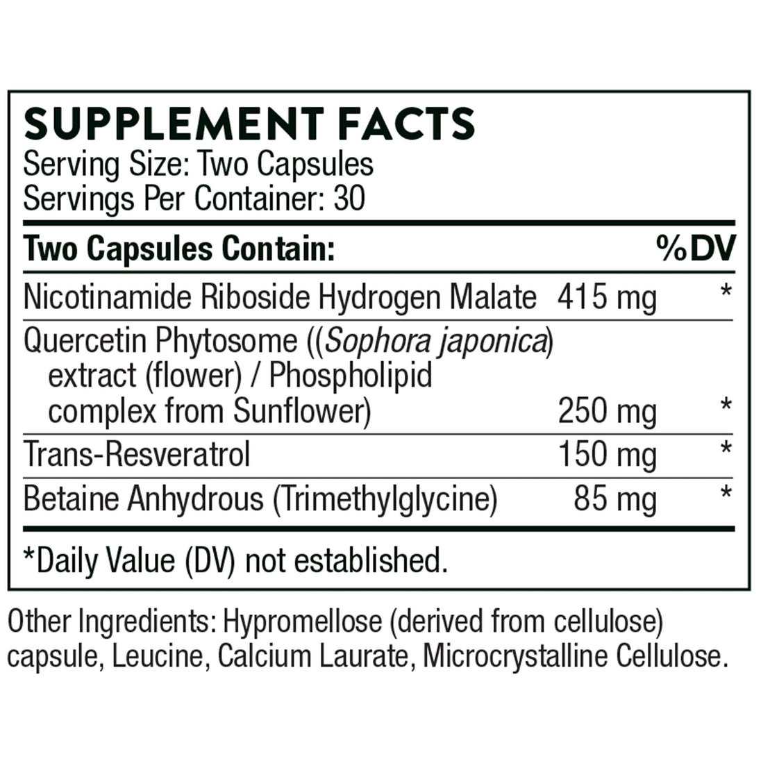 Thorne's ResveraCel supports cellular repair, up-regulates the sirtuin proteins, enhances NAD+ production, and benefits the cellular energy production that takes place in the mitochondria – thus supporting the process of healthy aging.