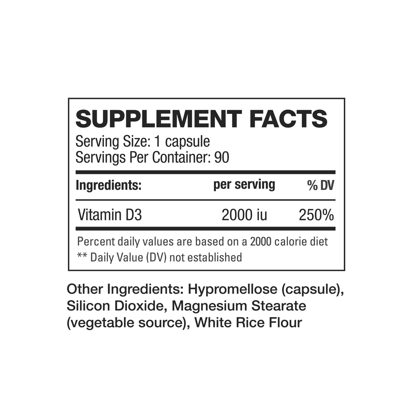 Each capsule of HD Muscle D3 contains 2000iu (50mcg) of high potency Vitamin D3. Take as directed.