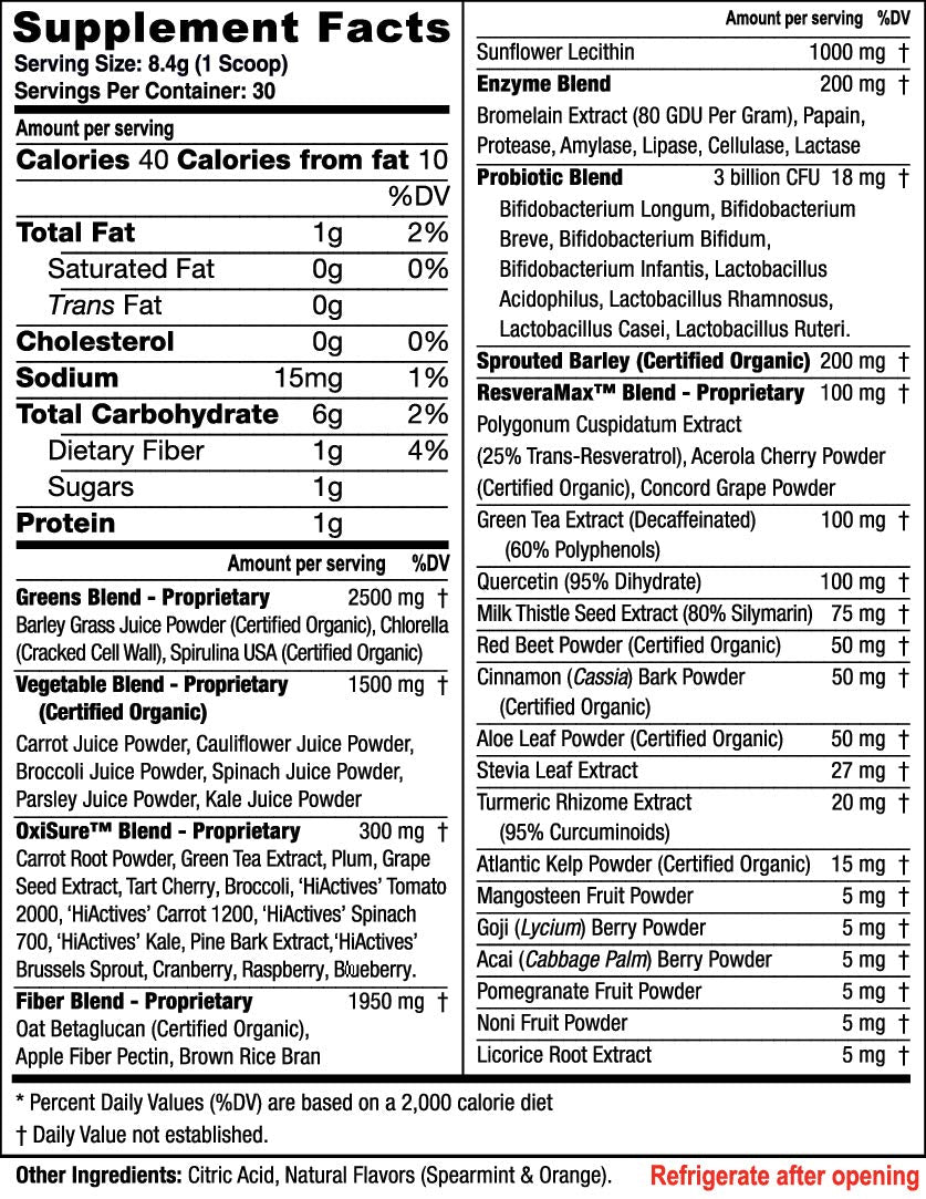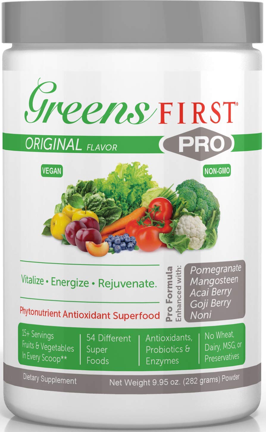 15+ servings of fruits and vegetables in every scoop! Greens First Pro is nutrient-rich, antioxidant super food that may help to alkalize, balance and nourish your whole body with a great taste! Greens First Pro is fortified with Beta-Glucan, a USDA patented oat fiber. Greens First Pro contains 54 different super foods , extracts and concentrates, including supergreens, vegetables, fruits, probiotics, soluble fiber, herbs, spices, natural flavonoids, enzymes and lecithin. Greens First Pro contains no yeast, corn, wheat, soy protein, dairy, egg, MSG, preservatives, artificial color or artificial flavor.