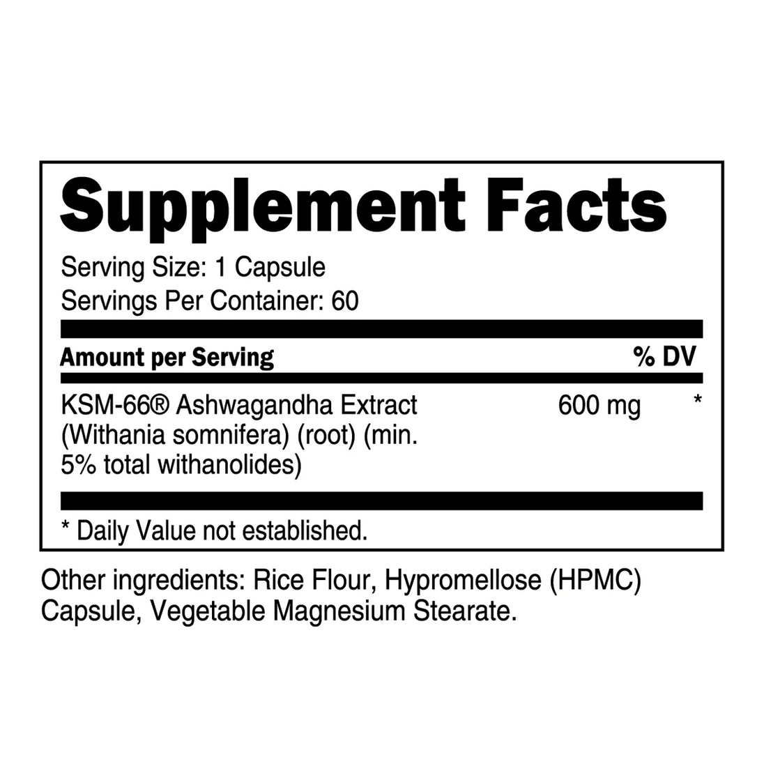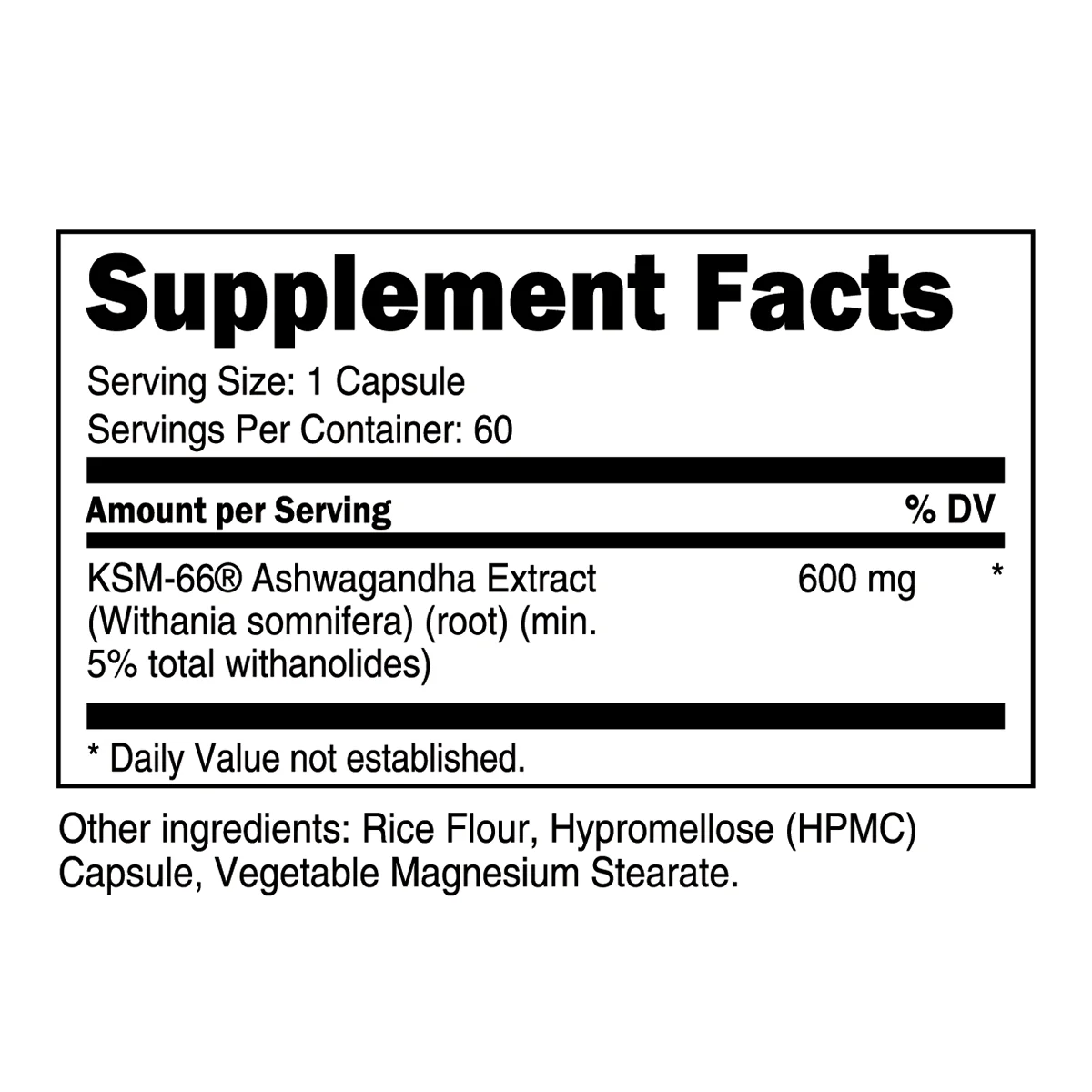 Each capsule provides the clinically studied dose of 600 mg KSM 66®, which is the most extensively studied ashwagandha extract available, standardized to contain 5% bioactive withanolides.