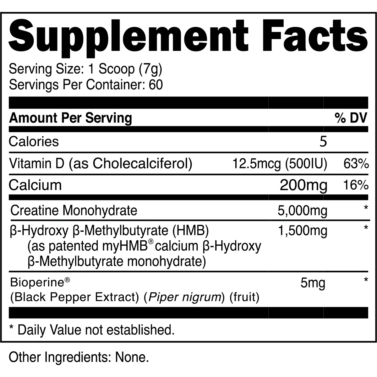 Creatine HMB is rounded out with BioPerine®, an absorption enhancer, and vitamin D3 for comprehensive muscle recovery and support of lean tissue mass.