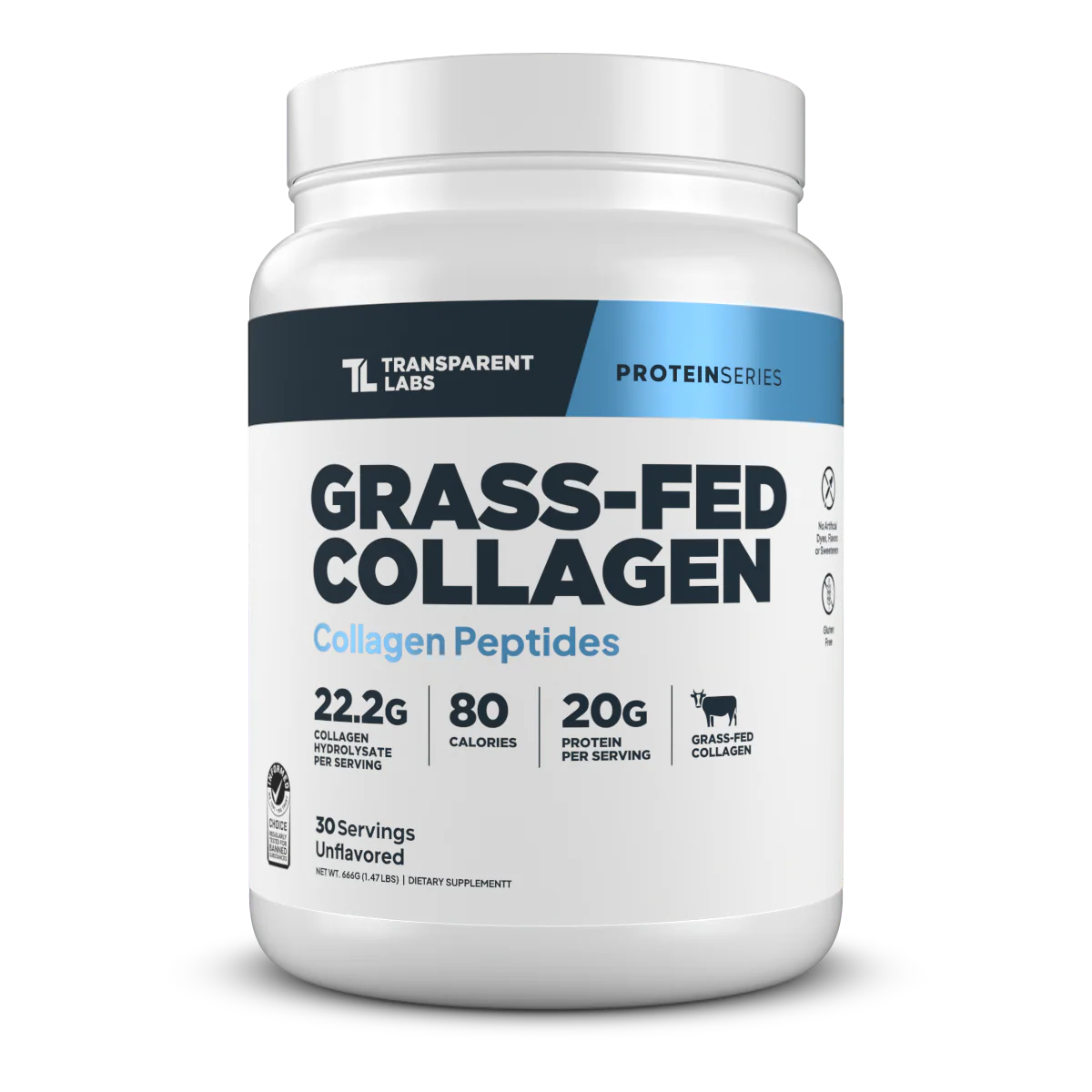 Transparent Labs Grass-Fed Collagen Hydrolysate contains 11 grams of hydrolyzed bovine (hide) collagen peptides per serving, derived exclusively from grass-fed cows. Collagen is the most abundant protein in the human body and is essential for skin health, joint support, strong bones, youthful hair and nails, and much more.