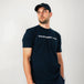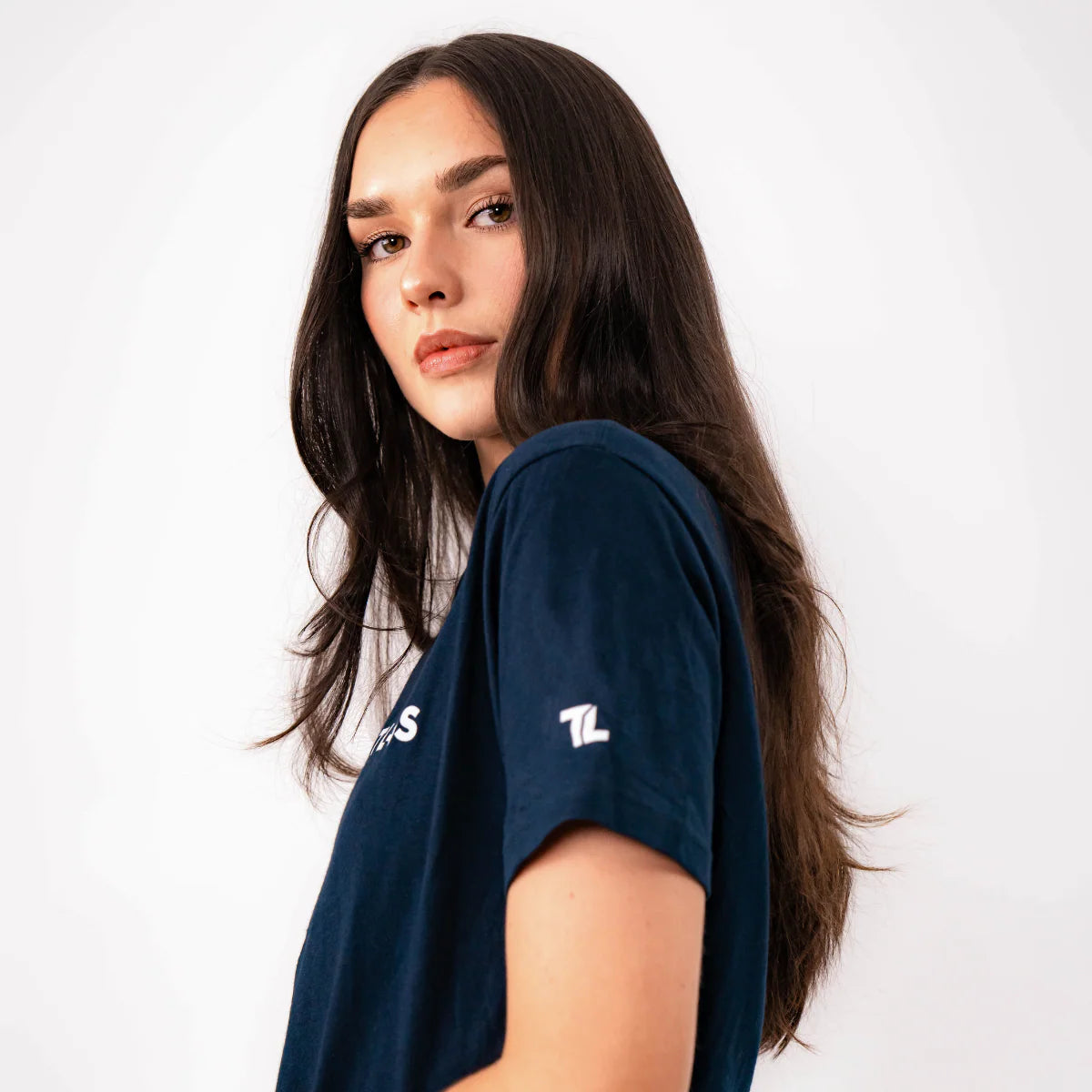 Soft, breathable navy cotton tee. Chest and sleeve screen prints. 100% combed ring-spun cotton. Unisex sizing, regular fit.