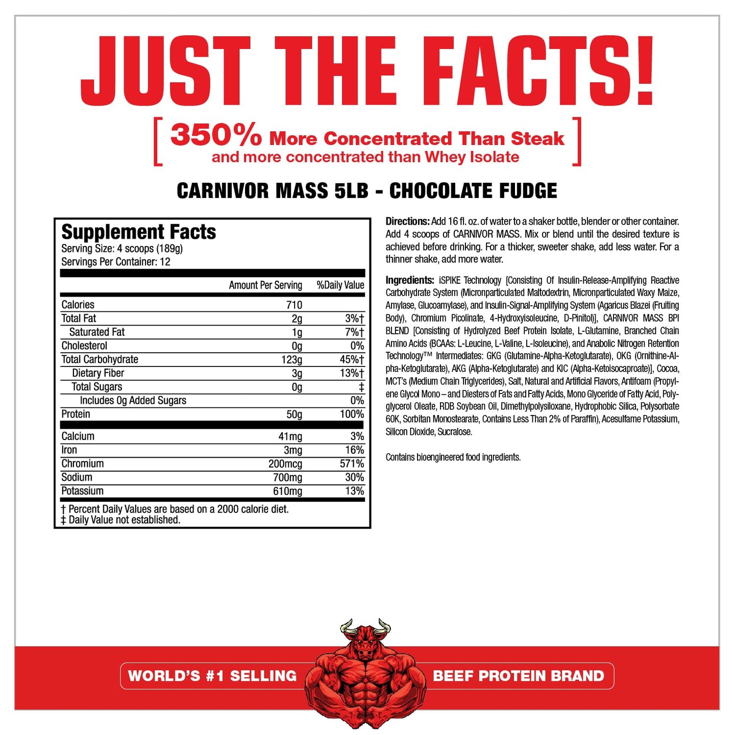 Beef Protein Isolate: Harness the muscle-building power of beef without any fat or cholesterol with 99% pure beef protein isolate. Hydrolyzed and highly concentrated in amino acids CARNIVOR BPI is a great lactose-free alternative to whey. This game-changing protein is 350% more concentrated in amino acids than steak and is clinically proven to build muscle. Each serving of CARNIVOR MASS provides 50 grams of beef protein isolate with 0 fat, 0 cholesterol and 0 lactose making it the ultimate protein source for athletes to support muscle building and recovery.